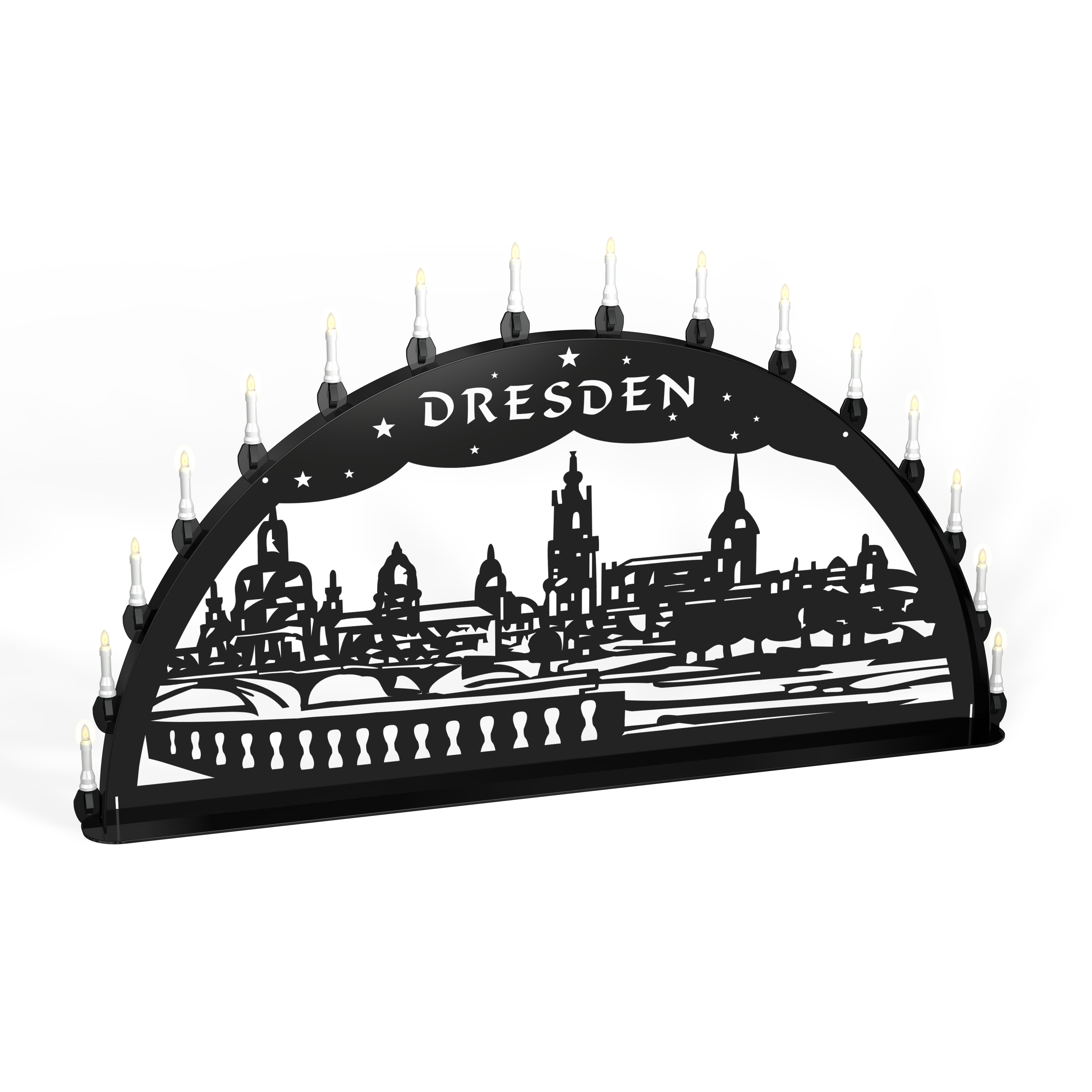 Produkt: Schwibbogen / Lichterbogen für Außen inkl. Lichterkette Motiv: Dresden CanalettoblickFarbe: tiefschwarz (RAL 9005) glänzend (andere Farben sind gerne auf Anfrage möglich)Größe: ca. 1200 x 540 mmMaterial: Stahl schwarz ca. 2,5 mmVersandkosten: kostenfrei (im Verkaufspreis sind 14,90 Euro Versand- und Verpackungskosten enthalten).Ausführung / Lieferumfang:Der Schwib- und Lichterbogen wird beidseitig mit EP-Grundierungspulver (für optimalen Korrosionsschutz im Außenbereich) + RAL 9005 tiefschwarz glänzend pulverbeschichtet Der Schwibbogen ist durch die Verarbeitung von Stahl und seinen Verstrebungen sehr robust gegen äußerere Einflüße und damit deutlich stabiler wie vergleichbare Schwibbögen aus Aluminium Durch die Verwendung von Stahl und einer Grundierung als Korrosionsschutz werden so zum einen die Stabilität und zum anderen die Witterungsbeständigkeit bestens gewährleistet eine Lichterkette (16 Kerzen) geeignet für den Außenbereich ist im Lieferumfang enthalten der Schwibbogen lässt sich mittels vorhandenen Standfuß auf einem Untergrund verschrauben möchten Sie den Schwib- und Lichterbogen auf einer Wiese befestigen finden Sie passende Erdspieße in unserem Shop unter Kategorie Zubehör (diese passen nur für die Varianten 1,2 Meter bis 3 Meter und nicht für die Variante 1 Meter)