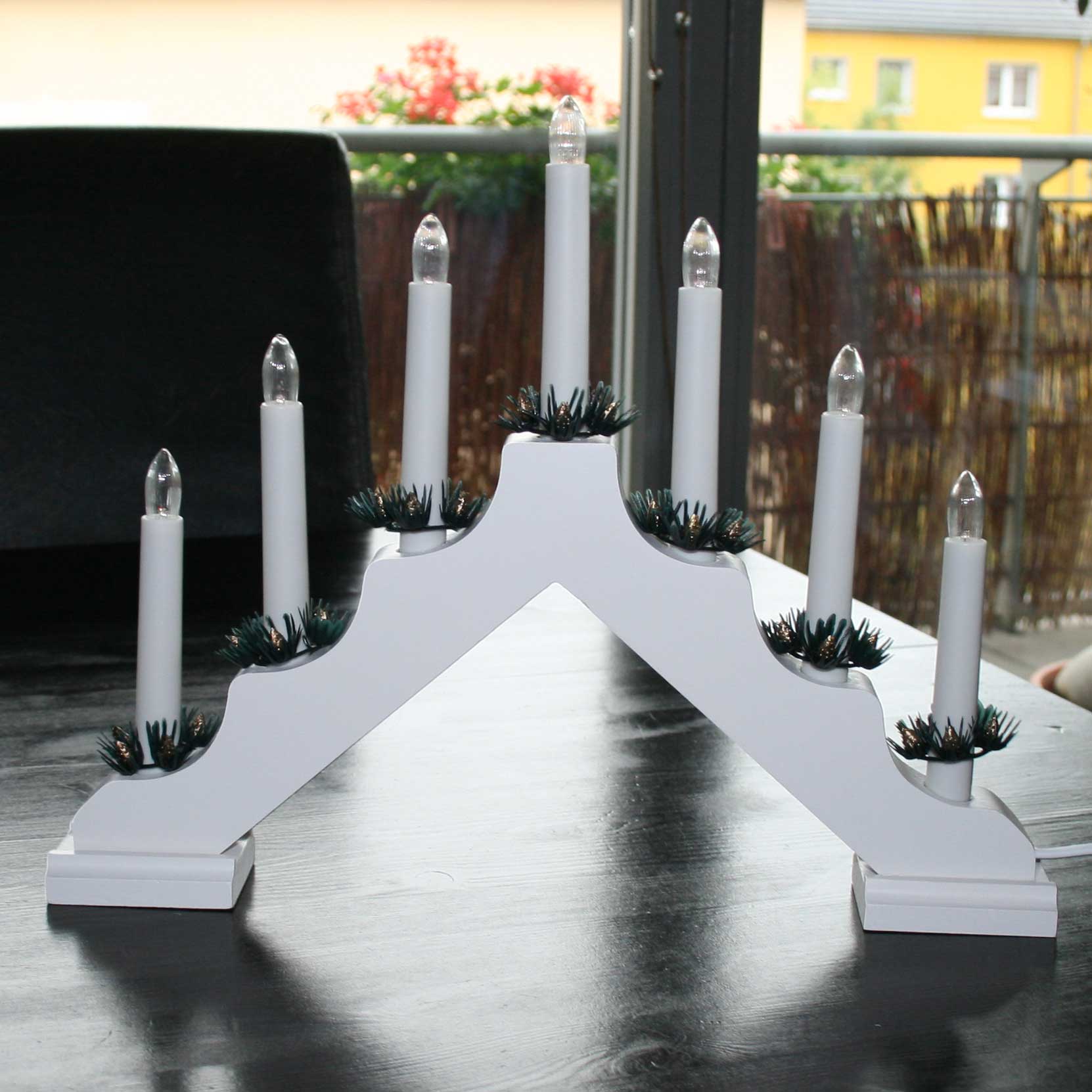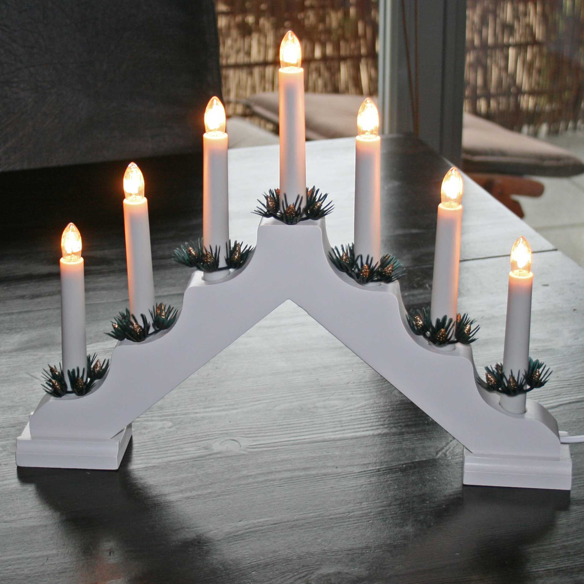Holz Fenster Leuchter Schwibbogen Lichterbogen / Farbe: weiß mit Tannen-Manchetten (verschiedene Modelle und Farben wählbar)